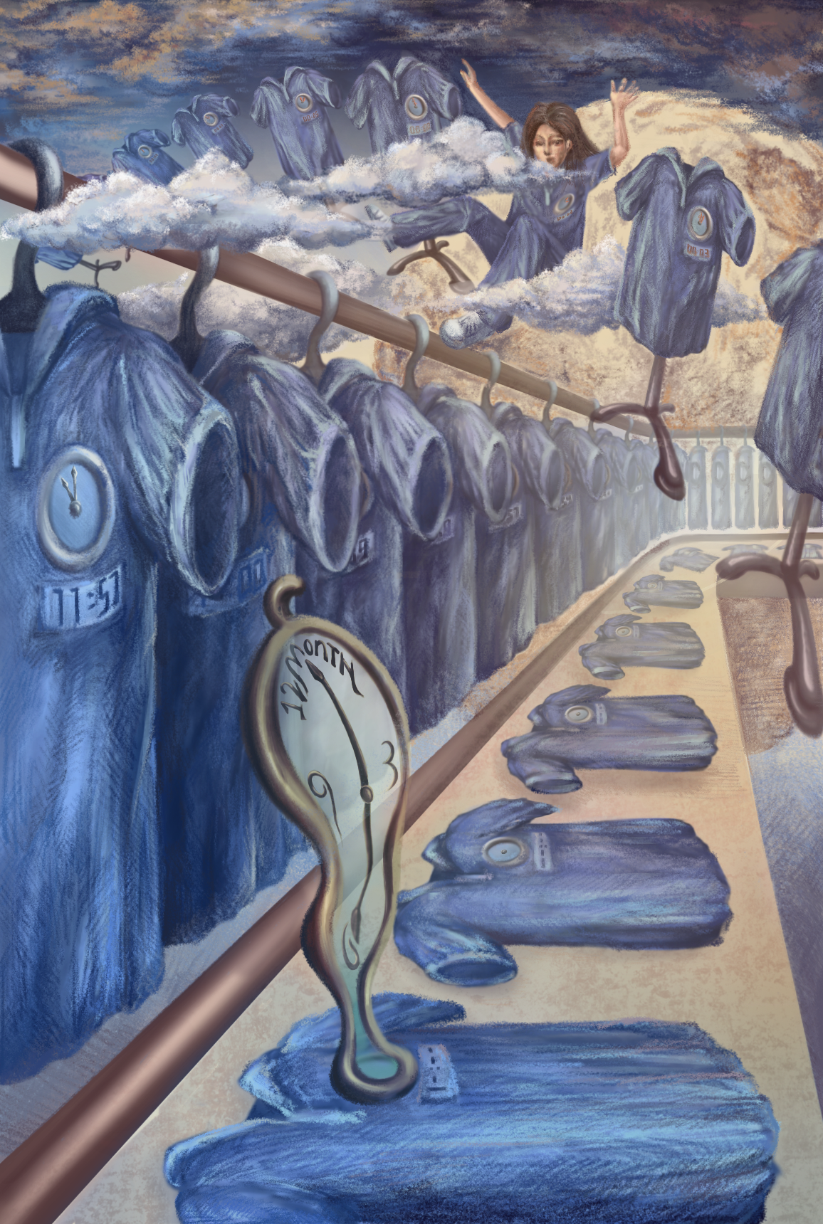 In a surreal dreamscape, the figure falls into a vast factory where uniforms are labeled with expiration dates. The repetitive pattern of garments reflects mass production and the fragility of modern consumption. Melting clocks hang from the ceiling, symbolizing time’s impermanence and the short lifespan of each product. Through rhythm and repetition, the work exposes the mechanized source of waste hidden behind the surface of everyday life.
