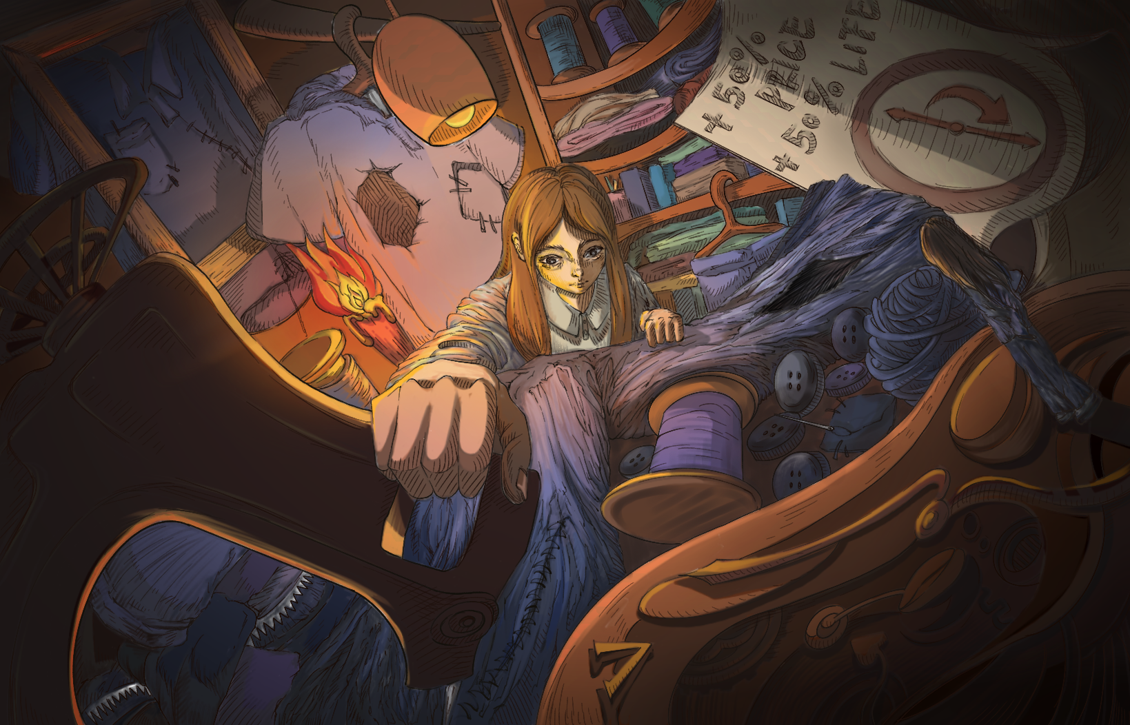 The figure enters a tailor shop specializing in repairing worn school uniforms. Stitches and patches symbolize human effort to resist waste, yet the imperfect texture reveals the limits of restoration. The enlarged perspective magnifies damaged parts, suggesting how repair, though meaningful, remains temporary. The work praises the beauty of care while questioning whether repair alone can sustain durability.