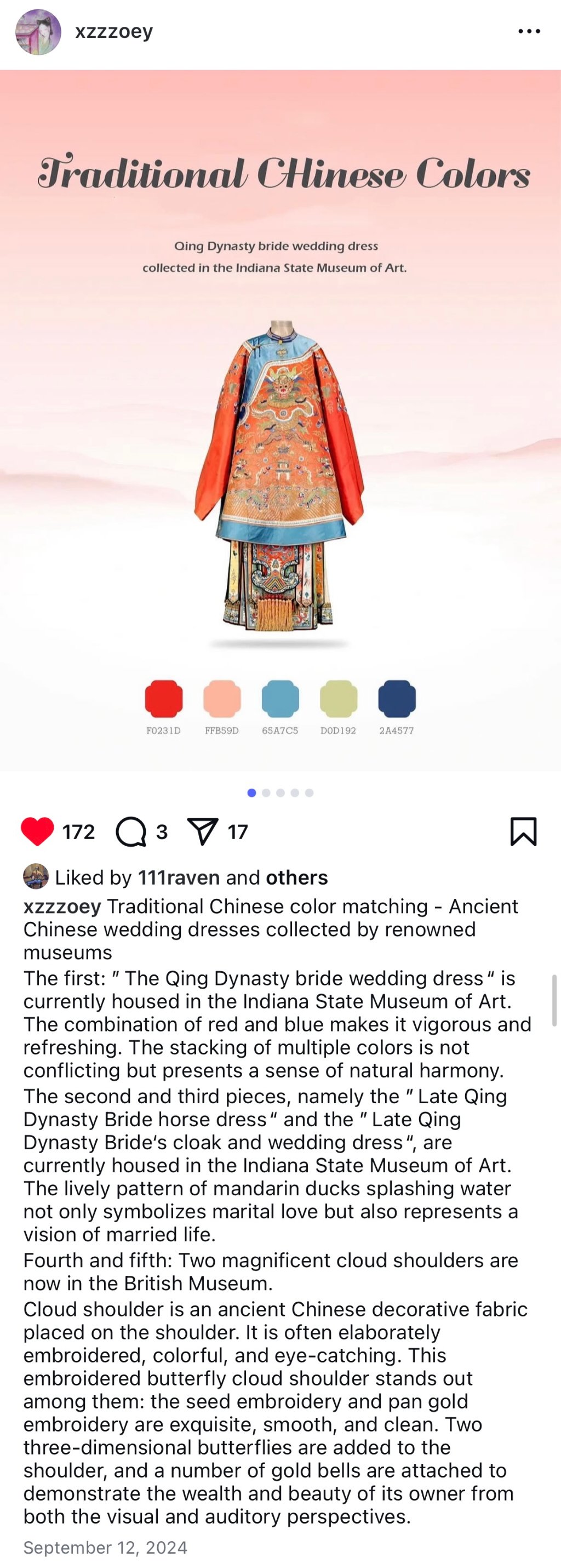 This is my Instagram account. I often share the applications of traditional Chinese colors in modern life. This ranges from the color palettes of ordinary ancient Chinese murals to Chinese aesthetics in contemporary contexts, including the layout of Chinese gardens, innovative interpretations of ancient Chinese cultural relics and artworks, as well as clothing, nail art and makeup in the new Chinese style. I usually share brand-new content on a weekly or monthly basis, which has attracted many people and fans viewing my posts and following my account.